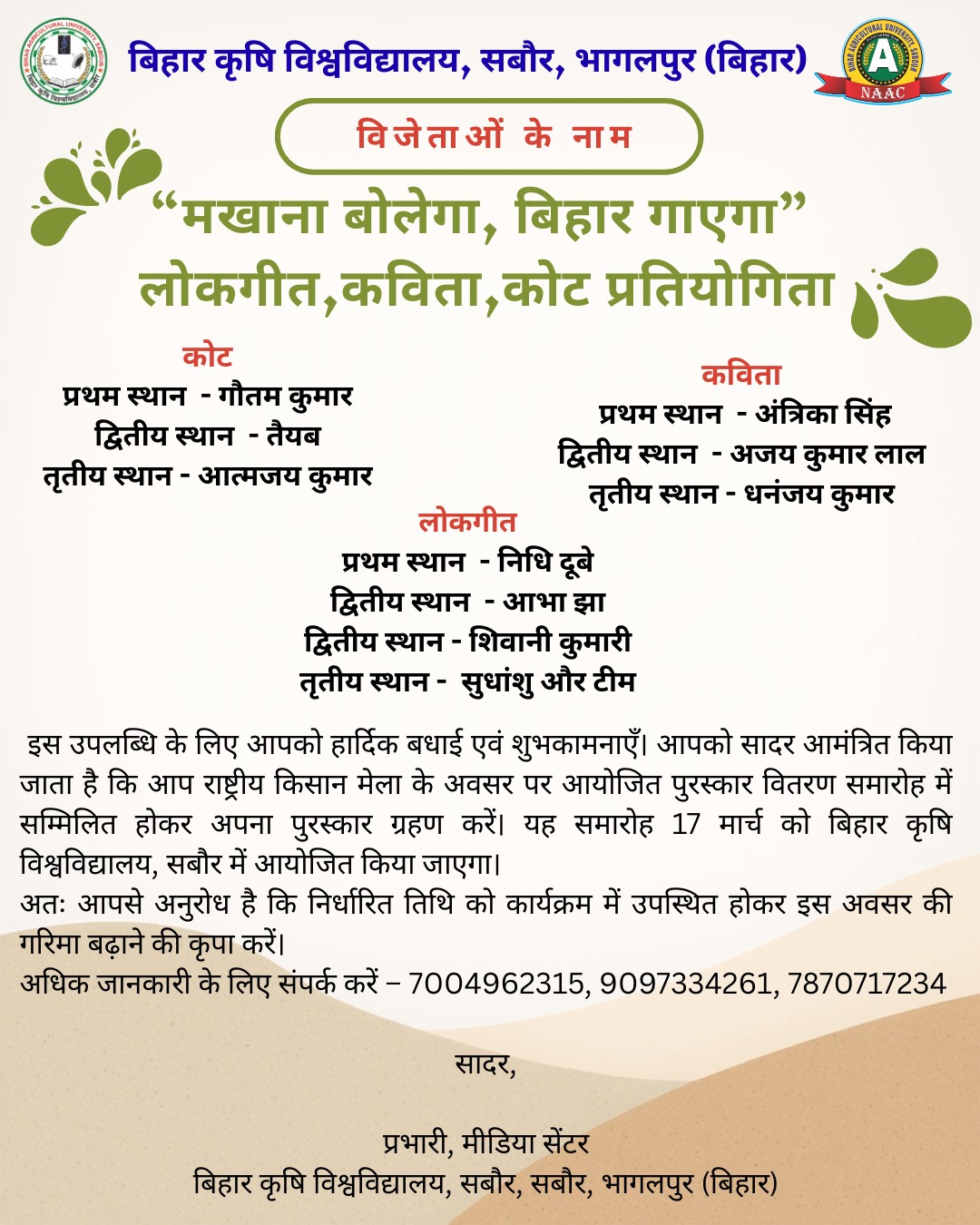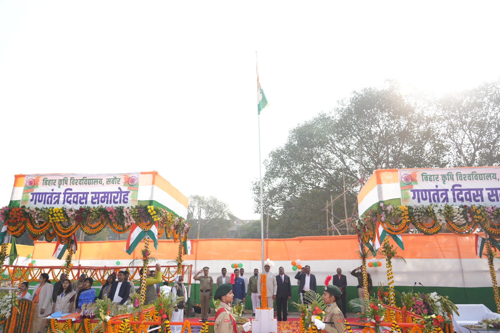 The successful inspection of the “Sabour Makhana Harvesting Machine” was conducted on 10 January 2026 at Bhola Paswan Shastri Agricultural College, Purnea, in the esteemed presence of Shri Narmadeshwar Lal, Hon’ble Principal Secretary, Agriculture Department, Government of Bihar. His visit reflected the Government of Bihar’s sustained commitment towards promoting mechanization and technological advancement in makhana cultivation. During the programme, the Hon’ble Principal Secretary interacted with scientists, faculty, staff, and students, and emphasized the importance of the makhana harvesting machine in reducing drudgery, improving operational efficiency, and enhancing the income of farmers engaged in makhana production. On this occasion, he also inaugurated the Navagraha Vatika, symbolizing the harmonious integration of traditional knowledge systems with contemporary agricultural education. Vice Chancellor, BAU, Sabour highlighted the pioneering role of Bihar Agricultural University, Sabour, in elevating makhana to national and global prominence and appreciated the scientific team for developing this farmer-centric innovation which is expected to benefit nearly five lakh makhana growers across the state.